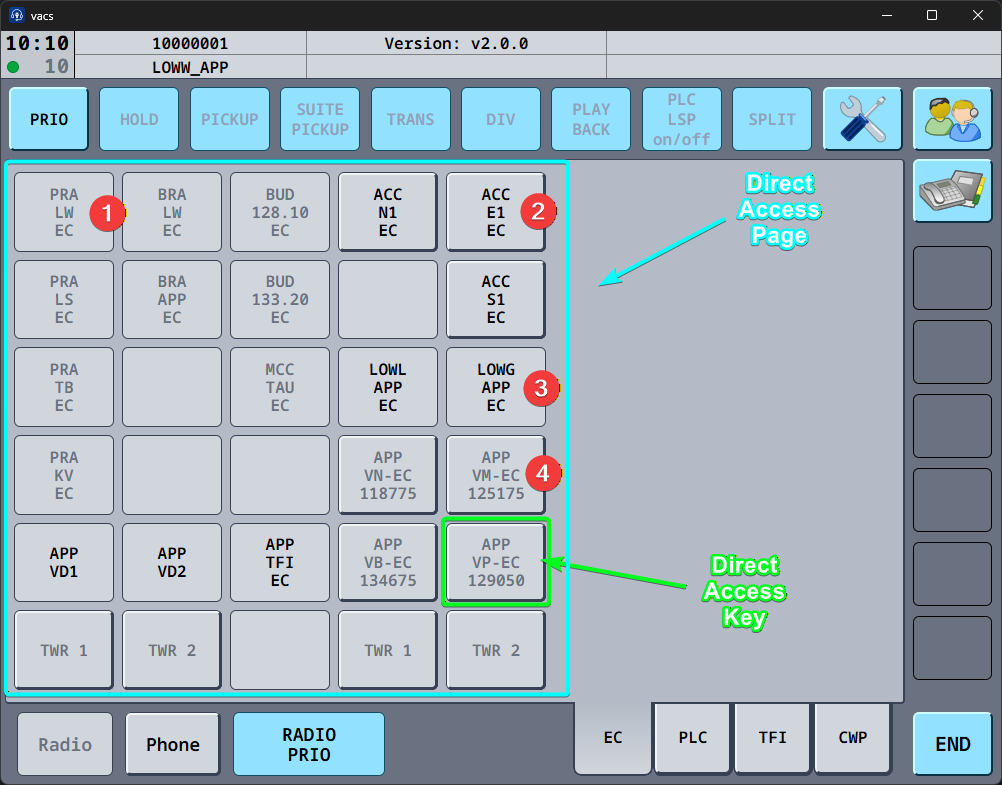 - Direct Access Key → An individual station button within the Direct Access Page used to initiate or receive calls.