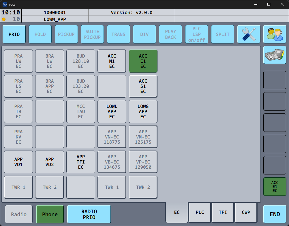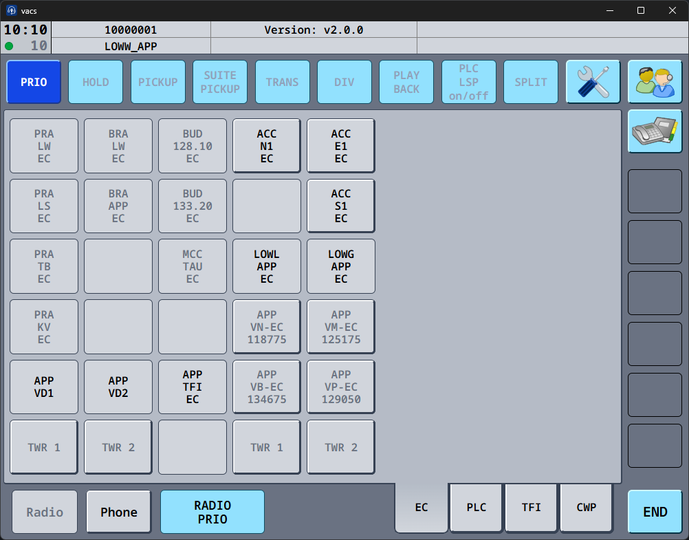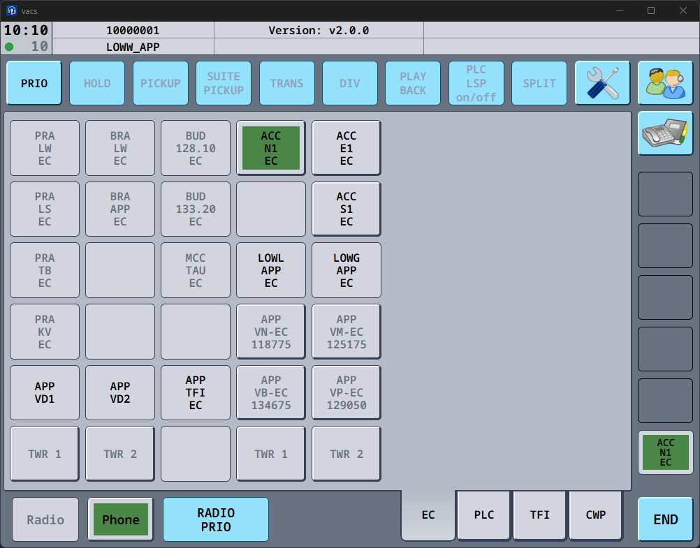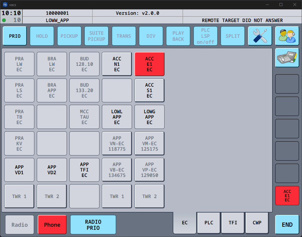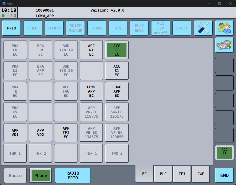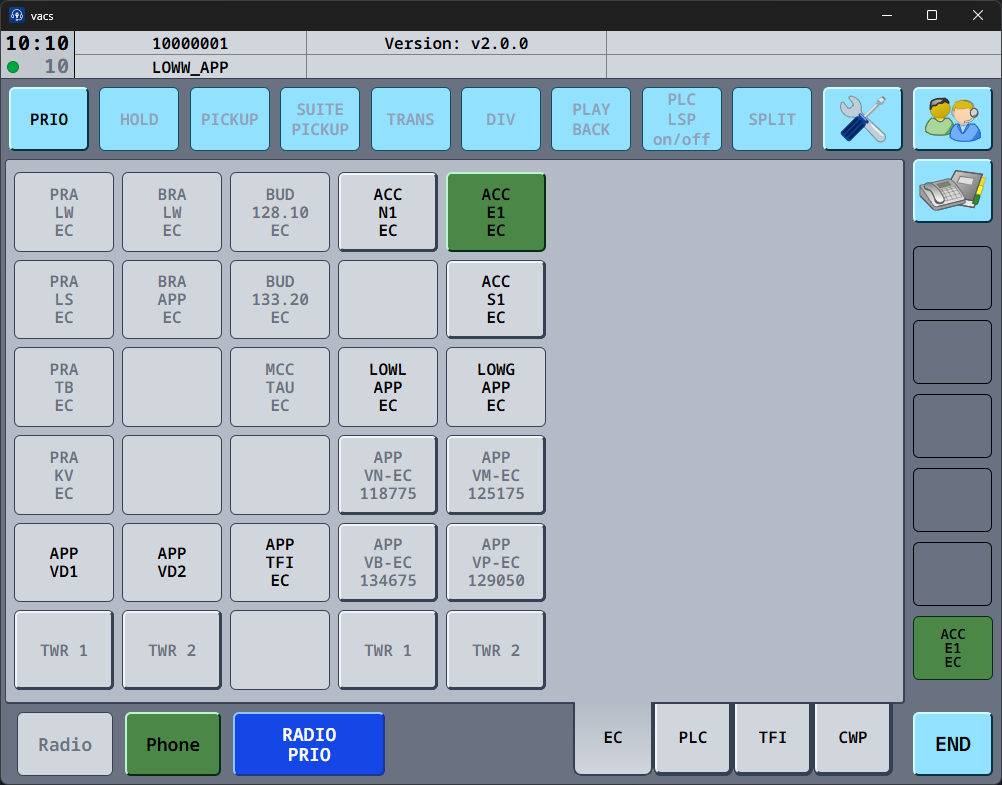 If the button is active (clickable) and the text appears in black color, this sector is online on VATSIM & vacs, and is ready to recieve your call. vacs will initiate a call to the controller currently covering this sector.
